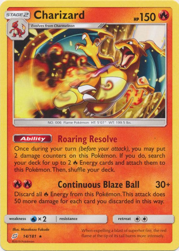 The Charizard 2019 Sun & Moon: Team Up #014/181 Base card in Raw TCG (Near Mint) condition has moved down -$12.50 (-62.5%) in the last 30 days and was last sold for $7.49 .