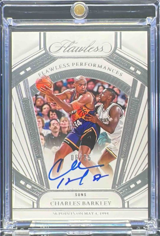 The Charles Barkley 2024 Flawless #2 2023 Flawless Performances /25 card is 1 of 47 Charles Barkley's card variations in the 2024 Flawless set being tracked by Sports Card Investor, including 2022 Enshrined Signatures /25, 2022 Excellence Signatures /25, 2022 Legendary Scripts /25, 2023 Flawless Achievements /25, and 2023 Flawless Shade Signatures /25.