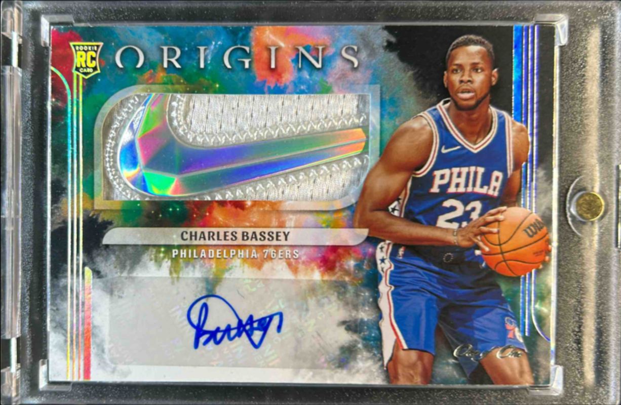 The Charles Bassey 2021 Origins #JA-BAS Rookie Jersey Autographs - Black /1 card is 1 of 38 Charles Bassey's card variations in the 2021 Origins set being tracked by Sports Card Investor, including Base, Red, Blue /99, Orange /75, and Pink /60.