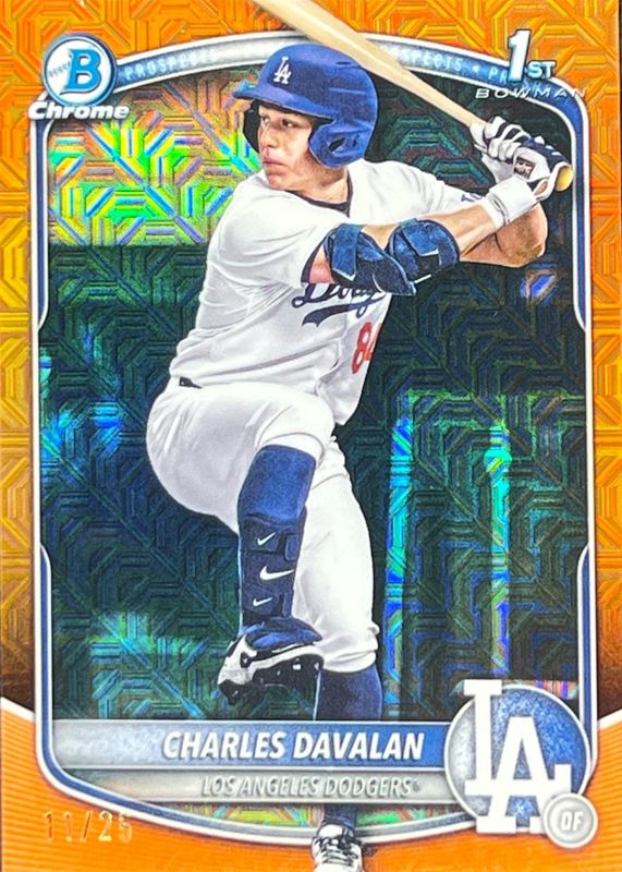 The Charles Davalan 2025 Bowman Draft Mega Box #BDC-96 Chrome - Orange Mega Refractor /25 (1st) card in Raw condition has moved up $4.00 (+12.9%) in the last 30 days and was last sold for $35.00 .