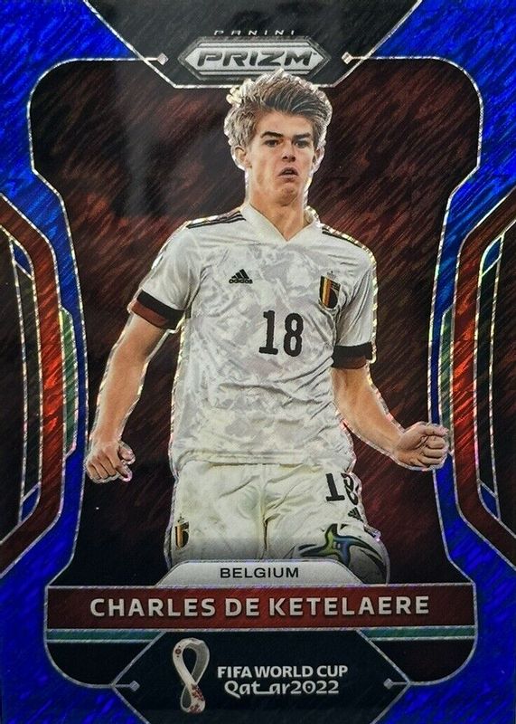 This card is 1 of 38 Charles de Ketelaere's card variations in the 2022 Prizm World Cup set being tracked by Sports Card Investor, including Base, Breakaway, Choice Red, Green Ice, and Green Wave.