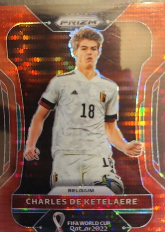 This card is 1 of 38 Charles de Ketelaere's card variations in the 2022 Prizm World Cup set being tracked by Sports Card Investor, including Base, Breakaway, Choice Red, Green Ice, and Green Wave.