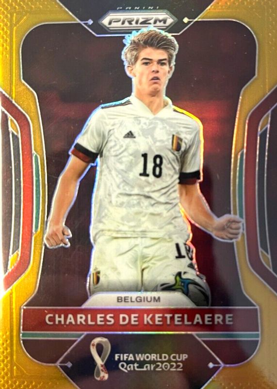This card is 1 of 38 Charles de Ketelaere's card variations in the 2022 Prizm World Cup set being tracked by Sports Card Investor, including Base, Breakaway, Choice Red, Green Ice, and Green Wave.