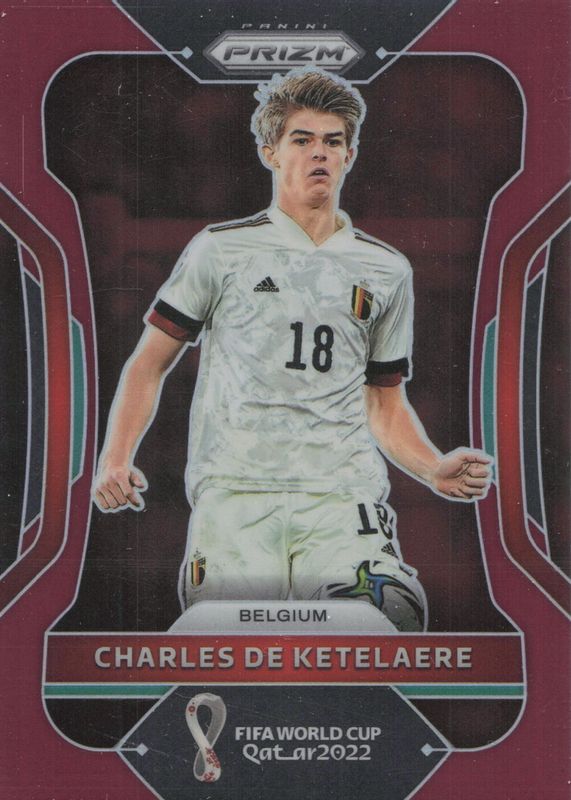 This card is 1 of 38 Charles de Ketelaere's card variations in the 2022 Prizm World Cup set being tracked by Sports Card Investor, including Base, Breakaway, Choice Red, Green Ice, and Green Wave.