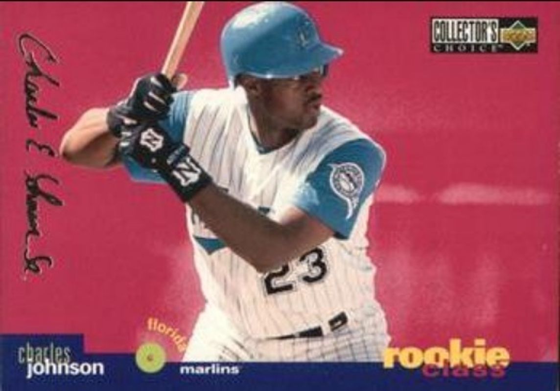 The Charles Johnson 1995 Upper Deck Collector's Choice #1 Silver Signatures Rookie card is 1 of 3 Charles Johnson's card variations in the 1995 Upper Deck Collector's Choice set being tracked by Sports Card Investor, including Base, and Gold Signatures.