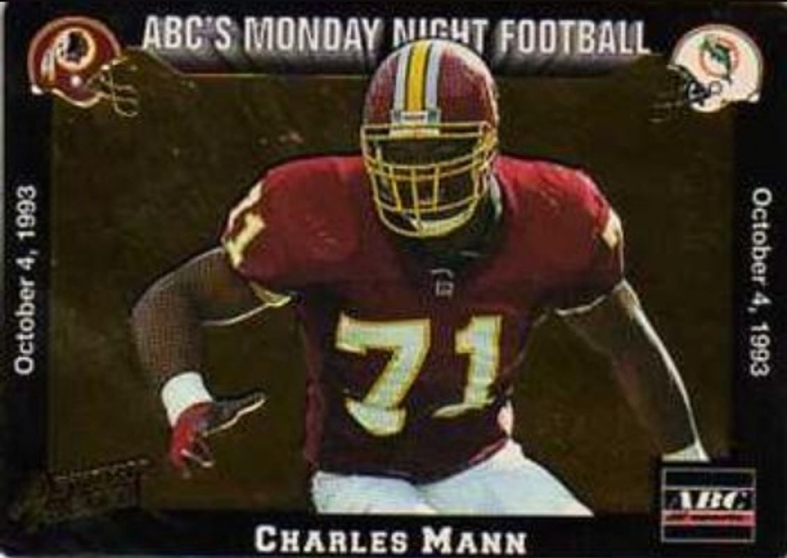 The Charles Mann 1993 Action Packed Monday Night #18 Base card is 1 of 2 Charles Mann's card variations in the 1993 Action Packed Monday Night set being tracked by Sports Card Investor, including Mint /250.