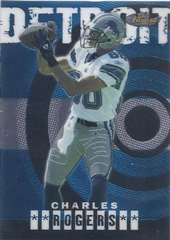 The Charles Rogers 2004 Topps Finest #13 Base /399 card is 1 of 9 Charles Rogers' card variations in the 2004 Topps Finest set being tracked by Sports Card Investor, including Refractors /199, Uncirculated Gold X-Fractors /150, Gold Refractor /50, X-Fractor /5, and Printing Plate Black /1.