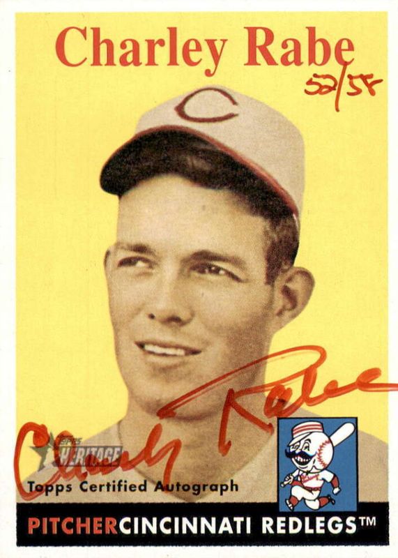 The Charley Rabe 2007 Topps Heritage #ROA-CR Real One Autographs - Red Ink /58 card in Raw condition has not changed in price in the last 30 days and was last sold for $44.95 .