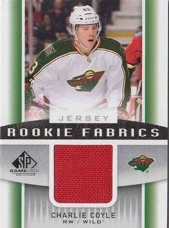 The Charlie Coyle 2013 SP Game Used #RF-CC Rookie Fabrics card is 1 of 10 Charlie Coyle's card variations in the 2013 SP Game Used set being tracked by Sports Card Investor, including Base /27, Rookie Fabrics Patch /35, Rookie Fabrics Gold /27, SIGnificant Numbers Autographs /27, and Inked Rookie Sweaters Patches /25.