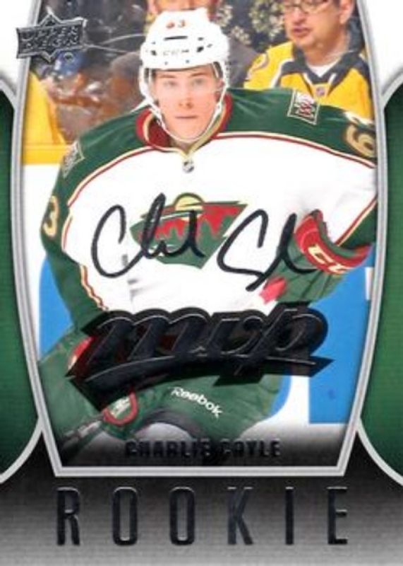 The Charlie Coyle 2013 Upper Deck #62 2013 Upper Deck MVP Rookie card is 1 of 15 Charlie Coyle's card variations in the 2013 Upper Deck set being tracked by Sports Card Investor, including Young Guns Base, Young Guns Canvas, Young Guns - Acetate, Young Guns - Jumbo, and Young Guns - UD Exclusives /100.