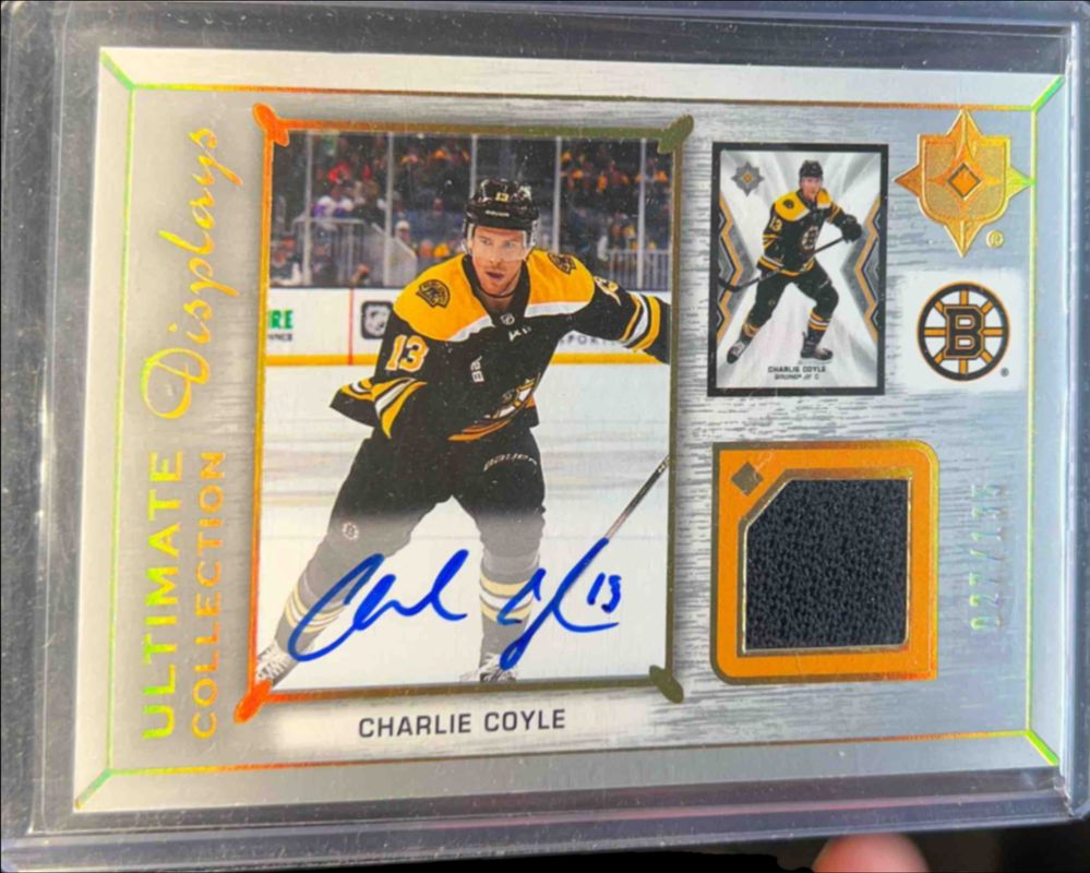The Charlie Coyle 2021 Upper Deck Ultimate Collection #UDA-CC Ultimate Display - Auto Jersey /99 card is 1 of 20 Charlie Coyle's card variations in the 2021 Upper Deck Ultimate Collection set being tracked by Sports Card Investor, including Base /299, Gold /35, Purple /15, Black /5, and Autographs.