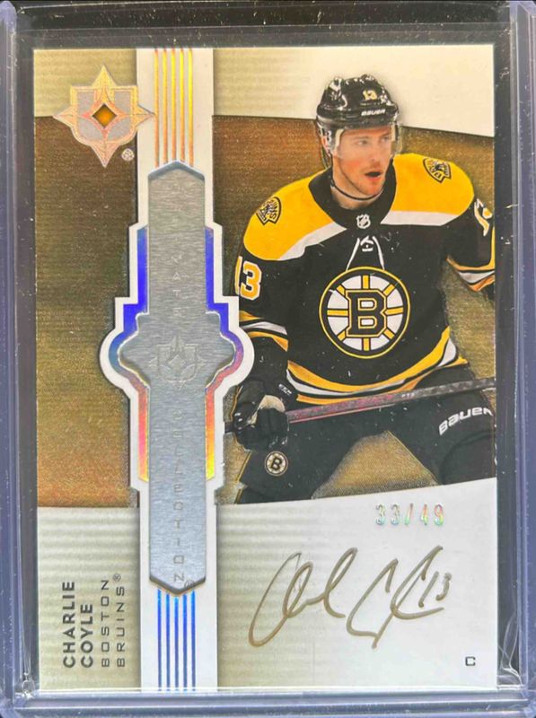 The Charlie Coyle 2021 Upper Deck Ultimate Collection #UE-CC Ultimate Emblems - Auto Gold /49 card is 1 of 20 Charlie Coyle's card variations in the 2021 Upper Deck Ultimate Collection set being tracked by Sports Card Investor, including Base /299, Gold /35, Purple /15, Black /5, and Autographs.