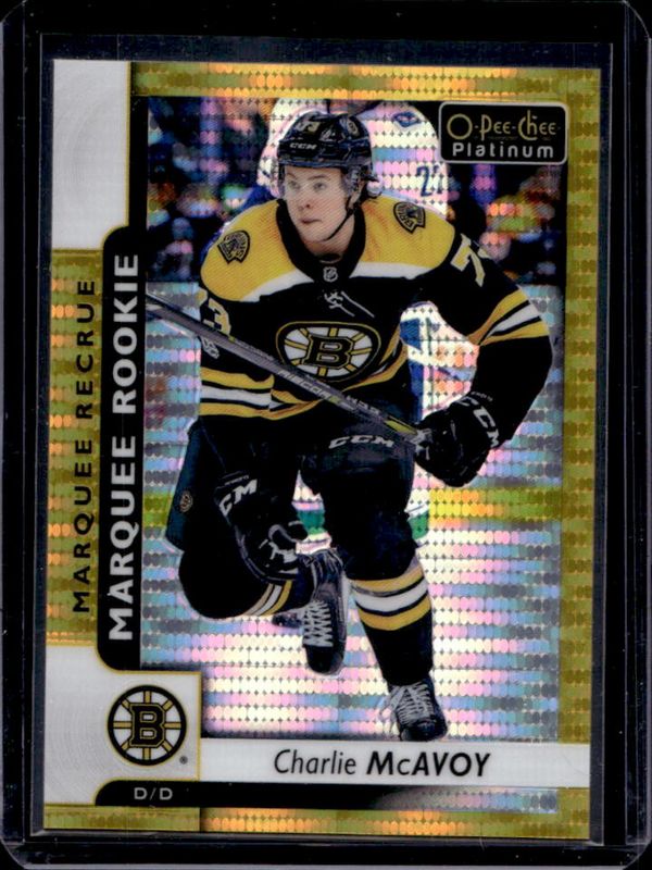 The Charlie McAvoy 2017 O-Pee-Chee Platinum #155 Seismic Gold /50 Rookie card is 1 of 37 Charlie McAvoy's card variations in the 2017 O-Pee-Chee Platinum set being tracked by Sports Card Investor, including Base, Rainbow, Violet Pixels, Red Prism /199, and Royal Blue Cubes /99.