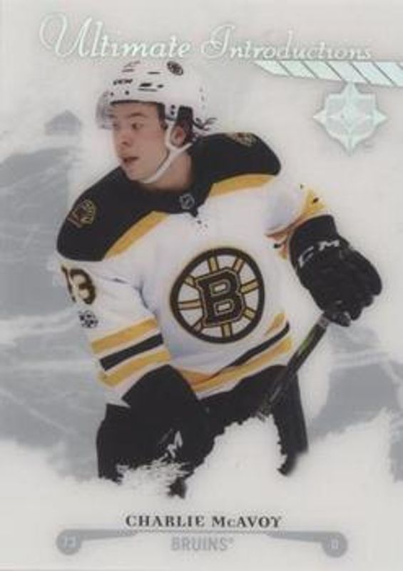The Charlie McAvoy 2017 Upper Deck Ultimate Collection #UI-37 Ultimate Introductions Rookie card is 1 of 22 Charlie McAvoy's card variations in the 2017 Upper Deck Ultimate Collection set being tracked by Sports Card Investor, including Base /99, Auto Patch /10, Shield Patch /1, Future Legacy Jersey, and Future Legacy Signatures.
