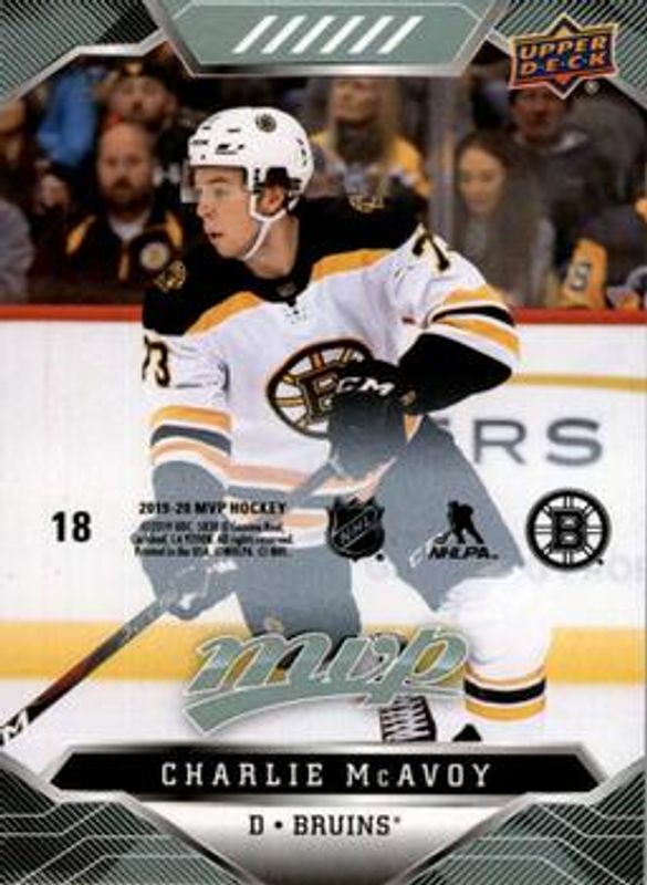 The Charlie McAvoy 2019 Upper Deck MVP #18 Puzzle Backs card is 1 of 16 Charlie McAvoy's card variations in the 2019 Upper Deck MVP set being tracked by Sports Card Investor, including Base, Blue, Gold Script, Silver Script, and Super Script /25.