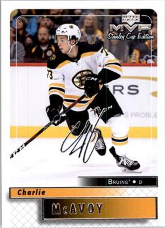 The Charlie McAvoy 2019 Upper Deck MVP #18 Stanley Cup Edition 20th Anniversary Silver Script card is 1 of 16 Charlie McAvoy's card variations in the 2019 Upper Deck MVP set being tracked by Sports Card Investor, including Base, Blue, Gold Script, Puzzle Backs, and Silver Script.
