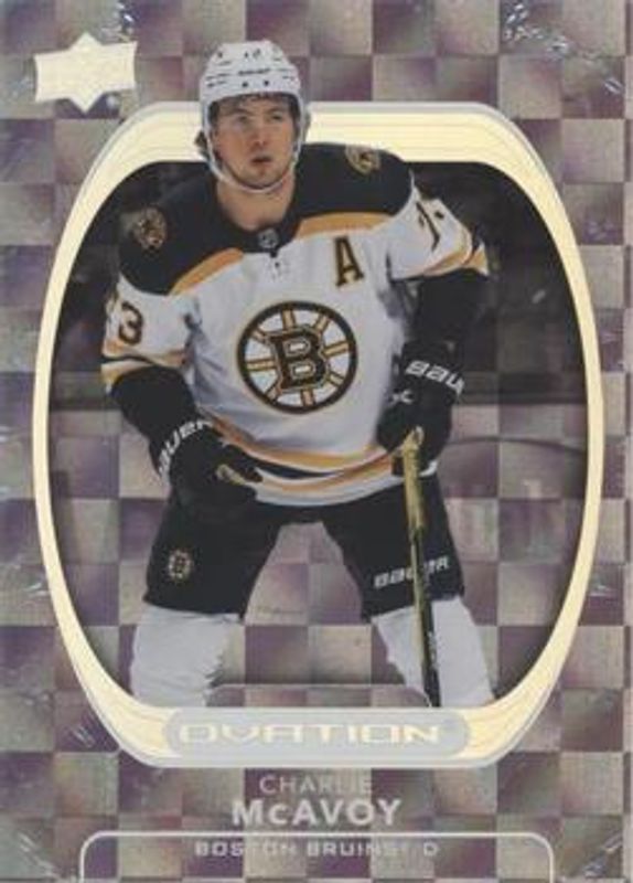 The Charlie McAvoy 2021 Upper Deck Ovation #36 Checkerboard card is 1 of 14 Charlie McAvoy's card variations in the 2021 Upper Deck Ovation set being tracked by Sports Card Investor, including Base, Gold Circular Wonder, Gold Foil, Silver Foil, and Standing Ovation /500.