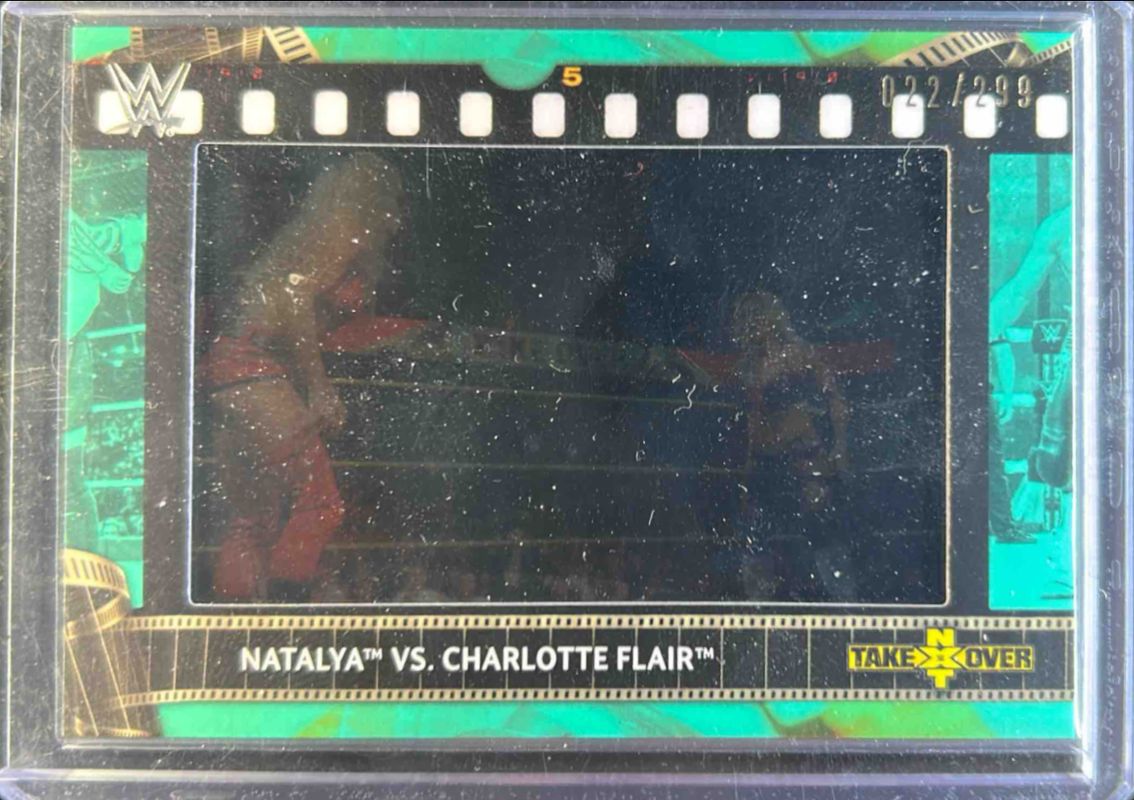 The Charlotte Flair 2021 Topps WWE #FS-NC Match Film Strips Manufactured Relics card is 1 of 54 Charlotte Flair's card variations in the 2021 Topps WWE set being tracked by Sports Card Investor, including Base, Bronze, Foilboard, Aqua /299, and Purple /25.