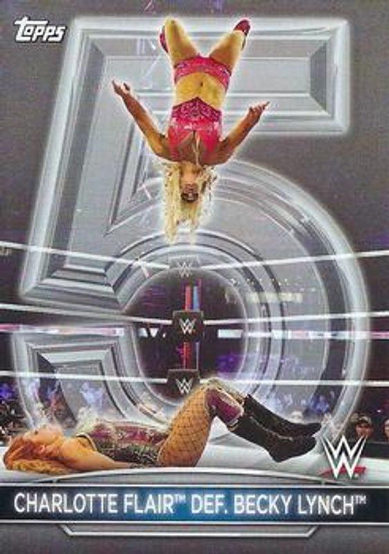 The Charlotte Flair 2021 Topps WWE Women's Division #SC-5 5th Anniversary Women’s Championship Tribute SmackDown card is 1 of 178 Charlotte Flair's card variations in the 2021 Topps WWE Women's Division set being tracked by Sports Card Investor, including #19 Base, #7 Base, #20 Base, #25 Base, and #31 Base.