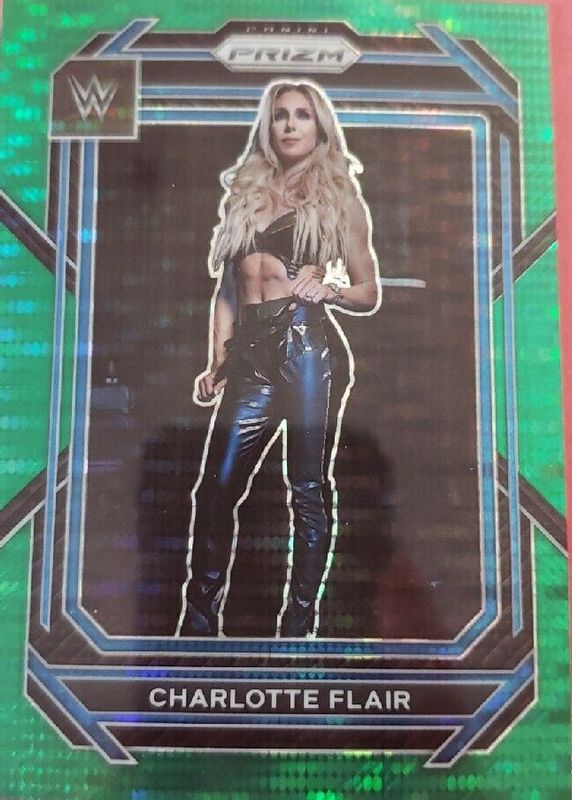 The Charlotte Flair 2023 Prizm WWE #123 Green Pulsar /25 card in Raw condition has not changed in price in the last 30 days and was last sold for $29.99 .