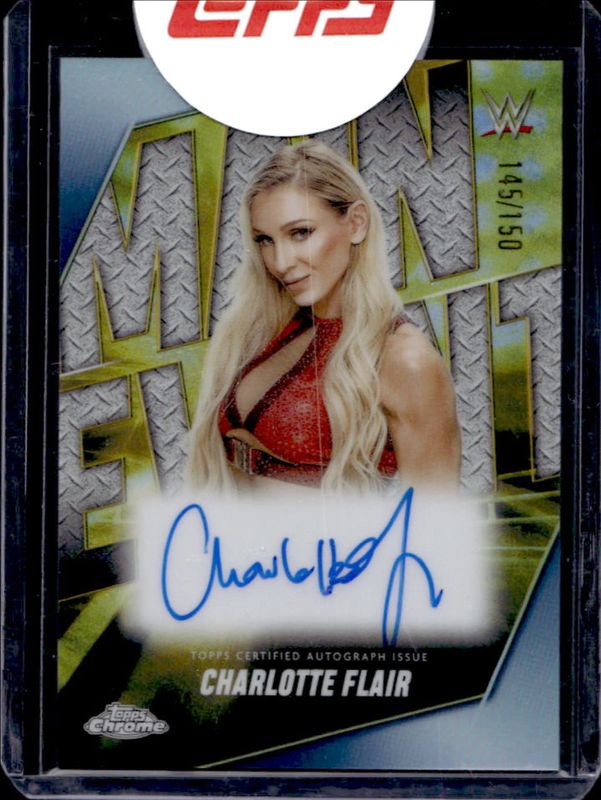 The Charlotte Flair 2025 Topps Chrome WWE #MEA-CFR Main Event Autographs - Blue Refractor /150 card is 1 of 88 Charlotte Flair's card variations in the 2025 Topps Chrome WWE set being tracked by Sports Card Investor, including #123 Base, #123 Black & Gold Refractor, #123 Geometric Refractor, #241 Image Variation, and #257 Image Variation.