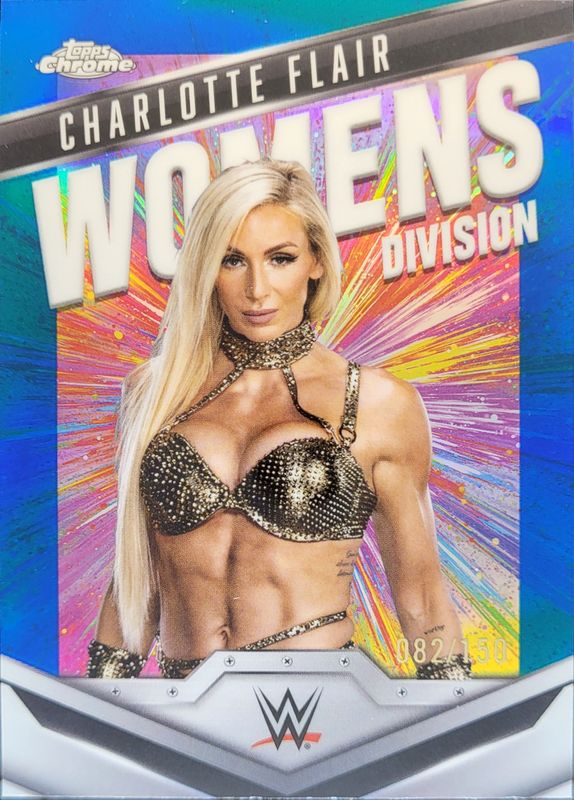 The Charlotte Flair 2025 Topps Chrome WWE #WD-CHA Women's Division - Blue Refractor /150 card is 1 of 88 Charlotte Flair's card variations in the 2025 Topps Chrome WWE set being tracked by Sports Card Investor, including #123 Base, #123 Black & Gold Refractor, #123 Geometric Refractor, #241 Image Variation, and #257 Image Variation.