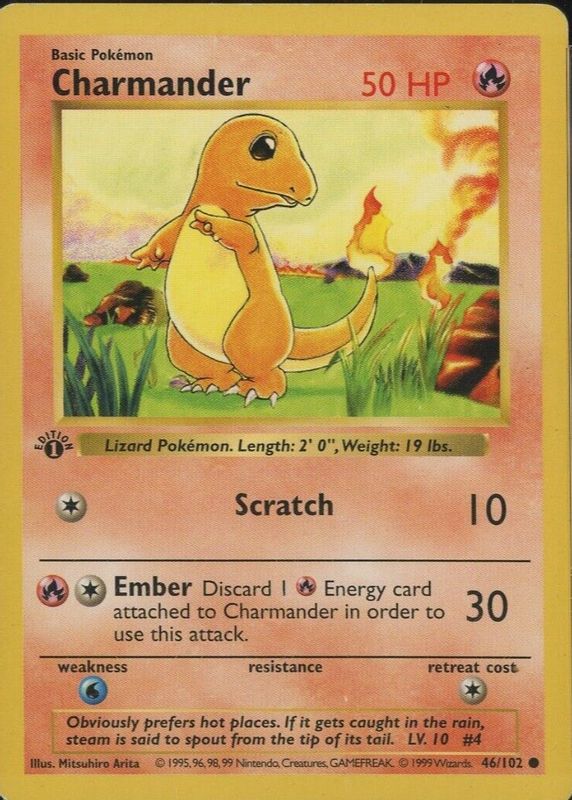 The Charmander 1999 Pokemon Game #46 1st Edition card in Raw TCG (Lightly Played) condition has moved up $49.26 (+55.8%) in the last 30 days and was last sold for $137.50 .