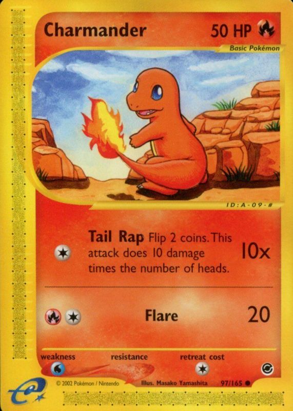 The Charmander 2002 Expedition #097/165 Base card in Raw TCG (Near Mint) condition has moved up $0.49 (+7.0%) in the last 30 days and was last sold for $7.49 .