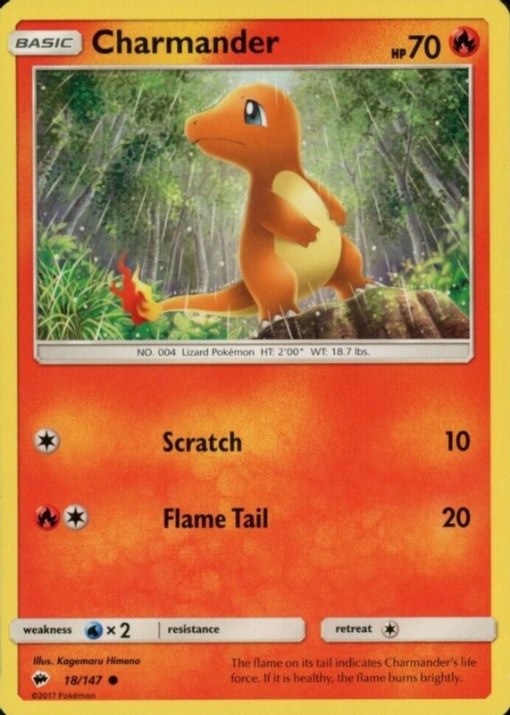The Charmander 2017 Sun & Moon: Burning Shadows #018/147 Base card in Raw TCG (Near Mint) condition has moved up $8.56 (+599%) in the last 30 days and was last sold for $9.99 .