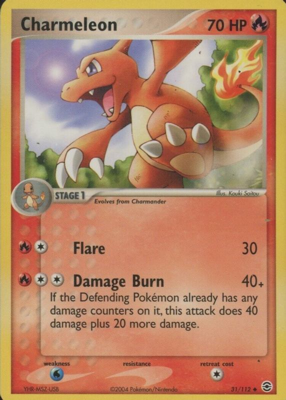 The Charmeleon 2004 EX: FireRed & LeafGreen #031/112 Base card in Raw TCG (Near Mint) condition has moved up $1.79 (+149%) in the last 30 days and was last sold for $2.99 .