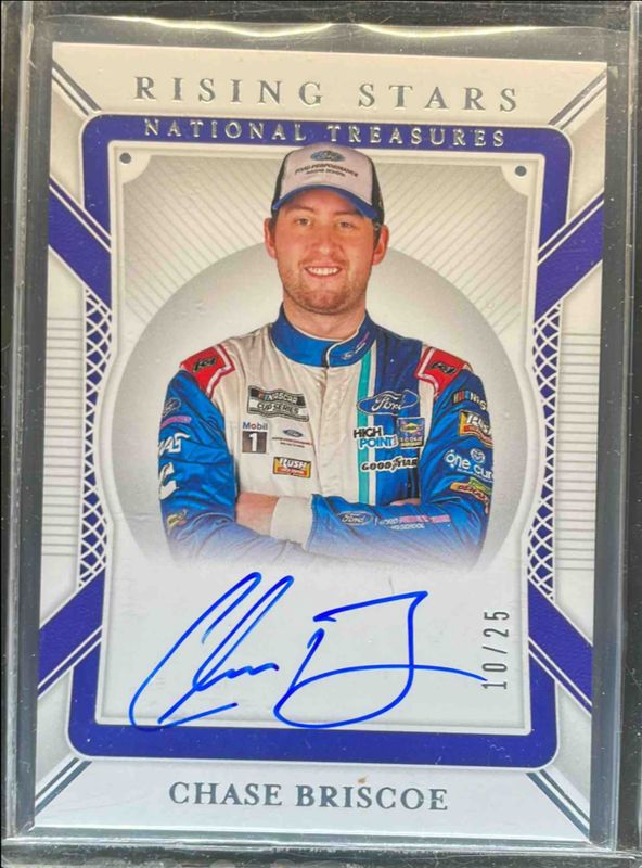 The Chase Briscoe 2021 National Treasures NASCAR #RS-CB Rising Stars /25 Rookie card is 1 of 20 Chase Briscoe's card variations in the 2021 National Treasures NASCAR set being tracked by Sports Card Investor, including Base /10, Holo Silver /7, Holo Gold /5, Green /3, and Holo Platinum Blue /1.