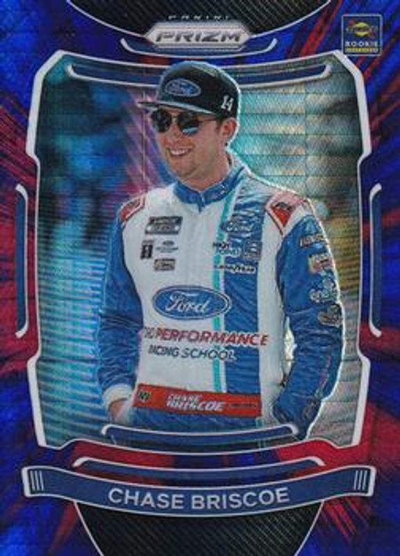 The Chase Briscoe 2021 Prizm NASCAR #27 Hyper Red & Blue Rookie card is 1 of 39 Chase Briscoe's card variations in the 2021 Prizm NASCAR set being tracked by Sports Card Investor, including Base, Blue, Hyper Blue & Carolina Blue, Hyper Green & Yellow, and Reactive Green.