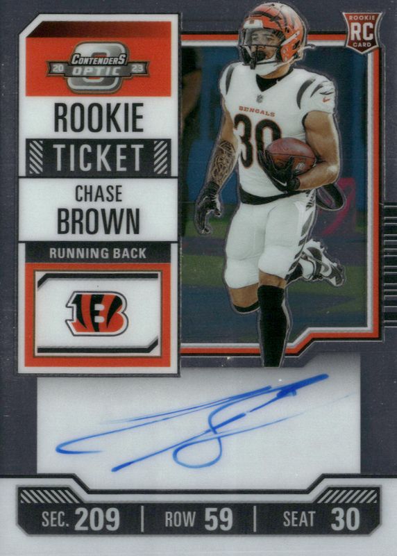 The Chase Brown 2023 Contenders Optic #105 Rookie Ticket Auto card in Raw condition has moved up $0.01 (+0.1%) in the last 30 days and was last sold for $20.00 .