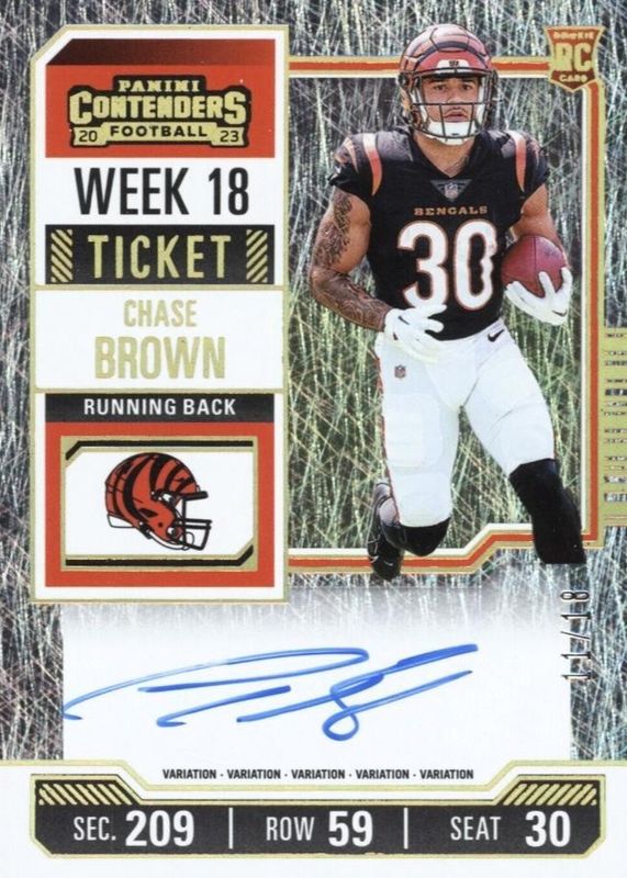 Chase Brown 2023 Contenders #105 Rookie Ticket Auto Variation - Week 18 /18 RAW Price Guide