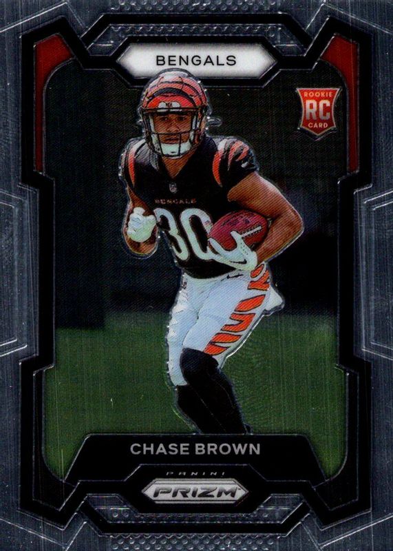 The Chase Brown 2023 Prizm #318 Base Rookie card in Raw condition has moved up $0.69 (+46.0%) in the last 30 days and was last sold for $2.19 .