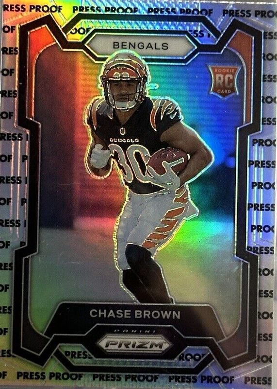 The Chase Brown 2023 Prizm #318 Press Proof /(SSP) Rookie card in Raw condition has not changed in price in the last 30 days and was last sold for $83.00 .