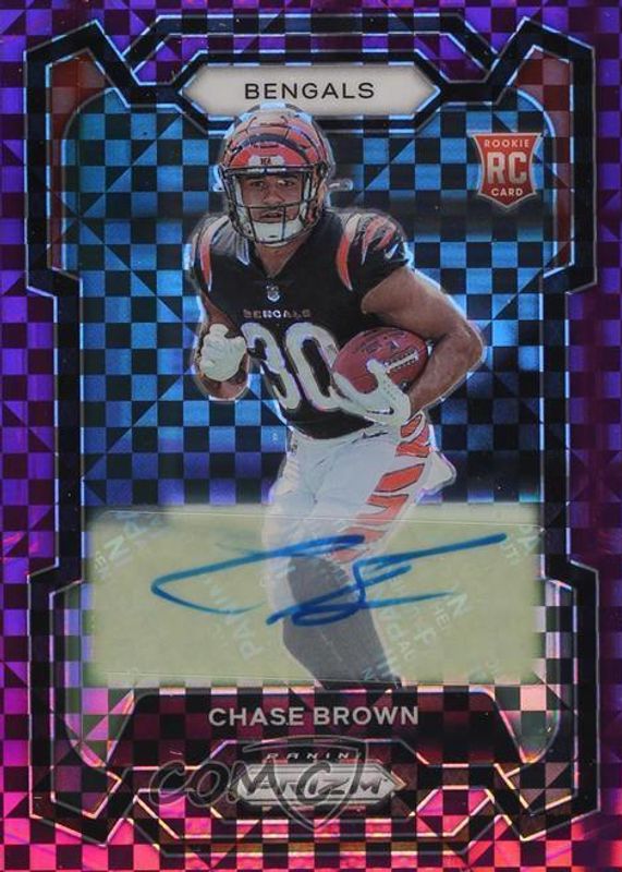 The Chase Brown 2023 Prizm #318 Rookie Autographs - Purple Power /49 card in Raw condition has not changed in price in the last 30 days and was last sold for $51.00 .