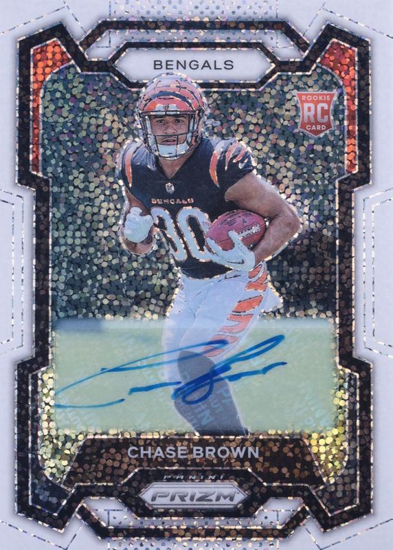 The Chase Brown 2023 Prizm #318 Rookie Autographs - White Sparkle /1 card in Raw condition has not changed in price in the last 30 days and was last sold for $990.00 .