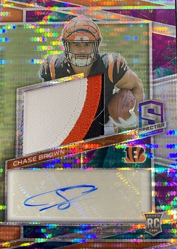 This card is 1 of 19 Chase Brown's card variations in the 2023 Spectra set being tracked by Sports Card Investor, including Rookie Patch Auto /99, Rookie Patch Auto - Supernova /70, Rookie Patch Auto - Hyper /60, Rookie Patch Auto - Neon Blue /50, and Rookie Patch Auto - Neon Green /35.
