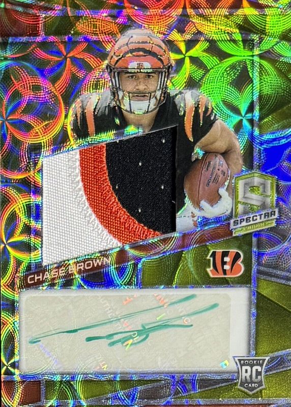 This card is 1 of 19 Chase Brown's card variations in the 2023 Spectra set being tracked by Sports Card Investor, including Rookie Patch Auto /99, Rookie Patch Auto - Celestial /75, Rookie Patch Auto - Supernova /70, Rookie Patch Auto - Hyper /60, and Rookie Patch Auto - Neon Blue /50.