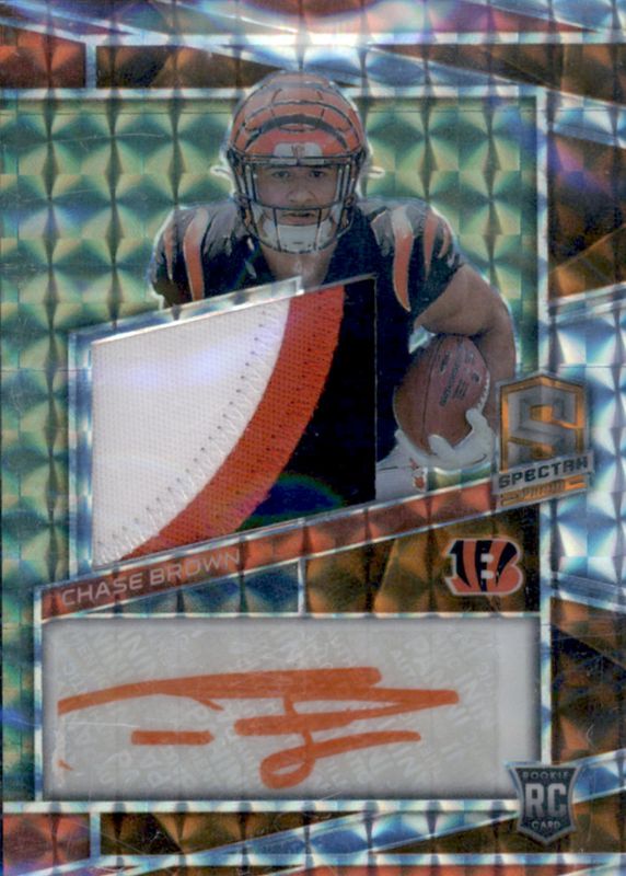 This card is 1 of 19 Chase Brown's card variations in the 2023 Spectra set being tracked by Sports Card Investor, including Rookie Patch Auto /99, Rookie Patch Auto - Celestial /75, Rookie Patch Auto - Supernova /70, Rookie Patch Auto - Hyper /60, and Rookie Patch Auto - Neon Blue /50.