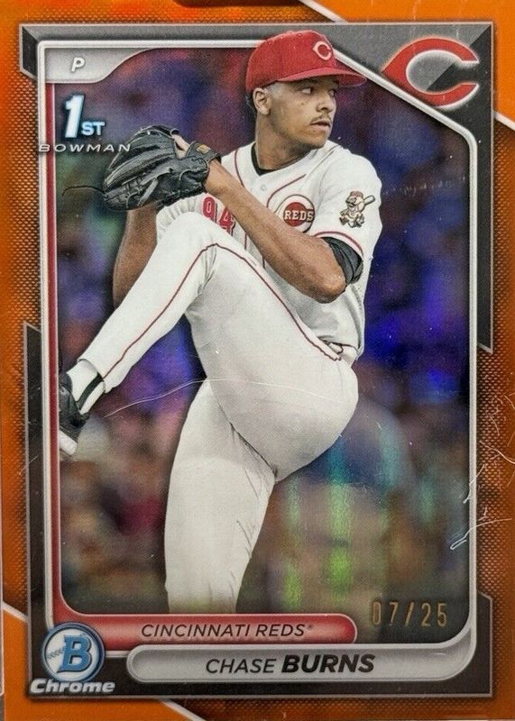 The Chase Burns 2024 Bowman Draft #BDC-55 Chrome - Orange Refractor /25 (1st) card in Raw condition has not changed in price in the last 30 days and was last sold for $175.00 .