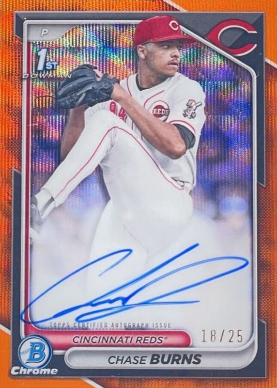Best Prices Available For Sale of Chase Burns 2024 Bowman Draft #CPA-CB Chrome Prospect Auto - Orange Wave Refractor /25 (1st)