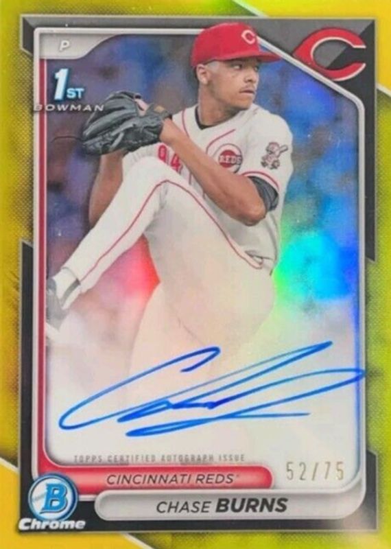 2024 Bowman Draft Chase Burns 1st Chrome Prospect Auto Yellow Refractor /75 REDS