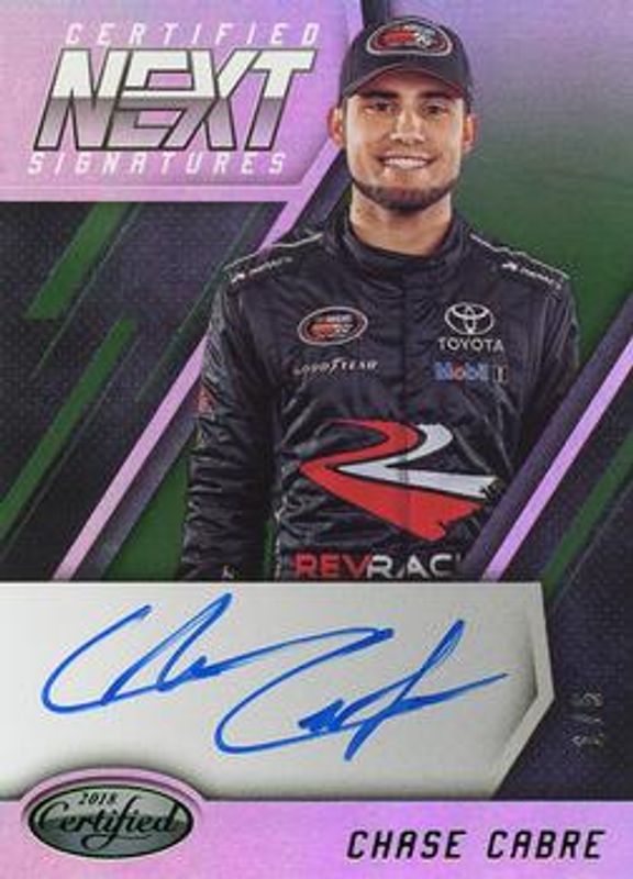 The Chase Cabre 2018 Certified NASCAR #NEXT-CC Certified Next Signatures - Green /5 card is 1 of 7 Chase Cabre's card variations in the 2018 Certified NASCAR set being tracked by Sports Card Investor, including Certified Next Signatures /210, Certified Next Signatures - Red /149, Certified Next Signatures - Blue /50, Certified Next Signatures - Gold /25, and Certified Next Signatures - Purple /10.