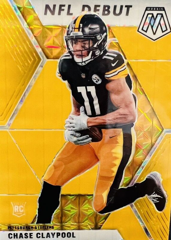 The Chase Claypool 2020 Mosaic #278 NFL Debut - Gold Fluorescent /20 Rookie card in Raw condition has not changed in price in the last 30 days and was last sold for $13.75 .
