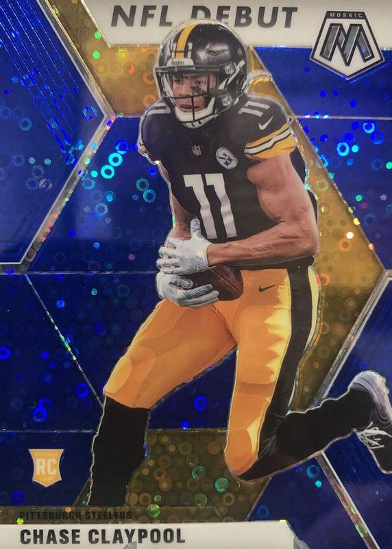 The Chase Claypool 2020 Mosaic #278 NFL Debut - No Huddle Blue /75 Rookie card in Raw condition has not changed in price in the last 30 days and was last sold for $5.00 .