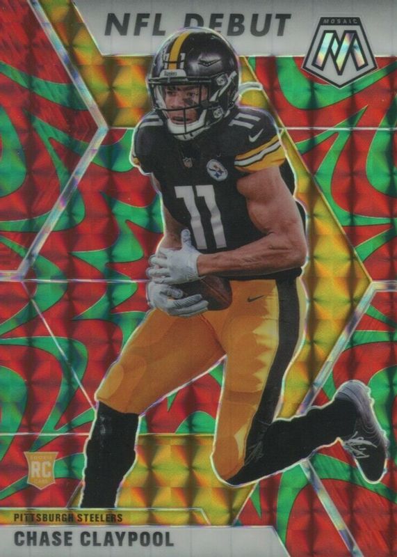 The Chase Claypool 2020 Mosaic #278 NFL Debut - Reactive Green Rookie card in Raw condition has not changed in price in the last 30 days and was last sold for $0.99 .