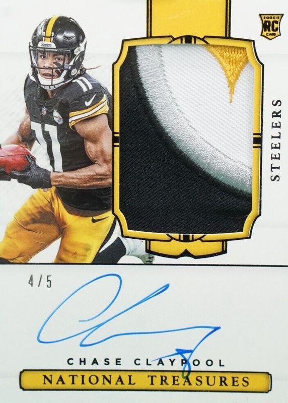 This card is 1 of 39 Chase Claypool's card variations in the 2020 National Treasures set being tracked by Sports Card Investor, including Rookie Patch Auto /99, Rookie Patch Auto - Green Jersey Number (/11), Rookie Patch Auto - Holo Silver /25, Rookie Patch Auto - Midnight /20, and Rookie Patch Auto - Stars & Stripes /20.