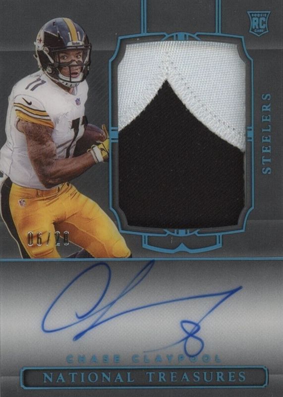 This card is 1 of 39 Chase Claypool's card variations in the 2020 National Treasures set being tracked by Sports Card Investor, including Rookie Patch Auto /99, Rookie Patch Auto - Green Jersey Number (/11), Rookie Patch Auto - Holo Silver /25, Rookie Patch Auto - Stars & Stripes /20, and Rookie Patch Auto - Holo Gold /10.